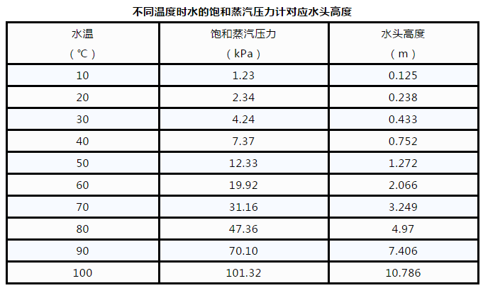 不同溫度時水的飽和蒸汽壓力計對應(yīng)水頭高度見下表: