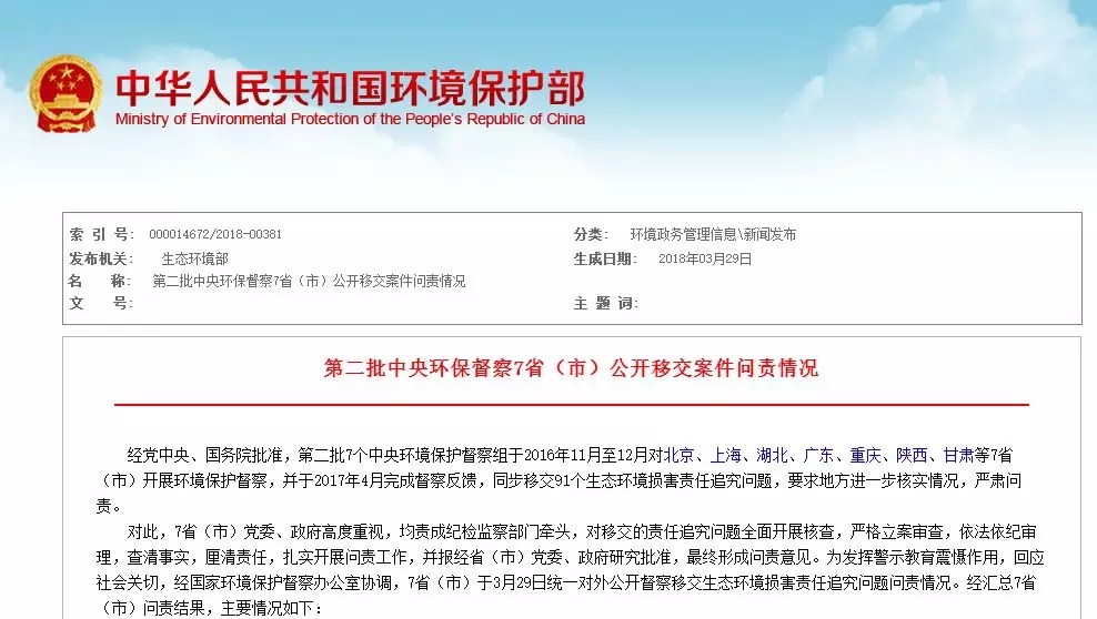 3月29日,北京、上海、湖北、廣東、重慶、陜西、甘肅等7?。ㄊ校ν夤_了第二批中央環(huán)保督察移交生態(tài)環(huán)境損害責(zé)任追究問題問責(zé)情況。