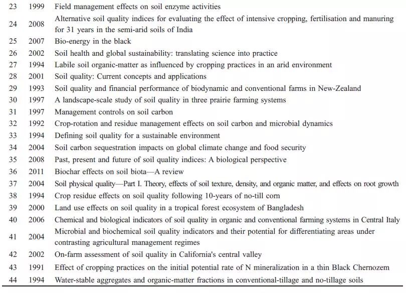 經(jīng)典文獻(xiàn)都密切關(guān)注了文獻(xiàn)發(fā)表時(shí)期該領(lǐng)域發(fā)展的熱點(diǎn)問題,因其較高的社會(huì)關(guān)注度、創(chuàng)新性和系統(tǒng)性,從而引發(fā)其他學(xué)者大量引用。通過對(duì)44 篇經(jīng)典文獻(xiàn)內(nèi)容的分析,2000 年以前多關(guān)注農(nóng)業(yè)管理措施對(duì)有機(jī)質(zhì)的影響和土壤質(zhì)量的概念,2000 年以后,對(duì)土壤質(zhì)量評(píng)價(jià)方法、評(píng)價(jià)指標(biāo)尤其是生物學(xué)指標(biāo)的研究不斷興起,更多地注重土壤質(zhì)量在農(nóng)業(yè)和環(huán)境方面的應(yīng)用,2008 年以來,關(guān)于土壤質(zhì)量與全球氣候變化、土壤修復(fù)的關(guān)系研究受到更多學(xué)者關(guān)注。從整個(gè)過程來看,土壤質(zhì)量從概念的產(chǎn)生到廣泛的應(yīng)用,一直圍繞農(nóng)業(yè)與環(huán)境的可持續(xù)發(fā)展,這也是人類可持續(xù)發(fā)展的主題之一。