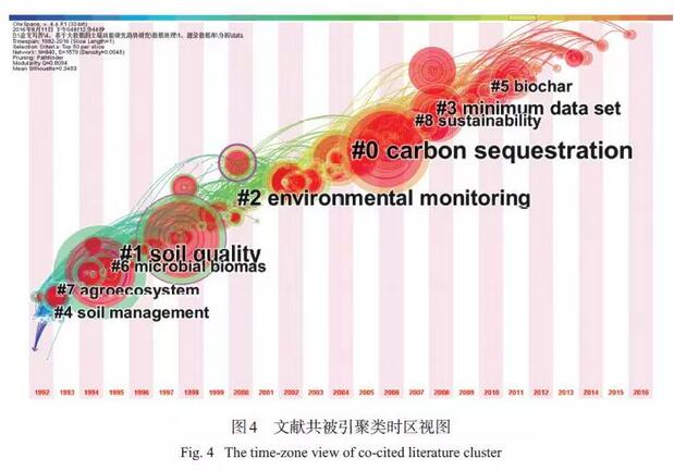 本研究中所認(rèn)為的“研究主題”是指在一定時(shí)段內(nèi),眾多學(xué)者探討和解決的中心問題,Citespace V通過對(duì)文獻(xiàn)共被引的分析,將研究內(nèi)容相似的文獻(xiàn)進(jìn)行歸類并命名。通過對(duì)5 551 篇文獻(xiàn)進(jìn)行共被引分析,共獲取28 個(gè)聚類,如果聚類中文獻(xiàn)數(shù)量較少,則會(huì)影響其命名的準(zhǔn)確性,因此本研究選取文獻(xiàn)數(shù)量在30 篇以上的8 個(gè)聚類進(jìn)一步分析,聚類的時(shí)間分布和命名見圖 4。通過圖4 可以發(fā)現(xiàn),研究早期(2000 年以前) 主題較為分散,主要集中在土壤管理(#4)、農(nóng)業(yè)生態(tài)系統(tǒng)(#7)、微生物生物量(#6)、土壤質(zhì)量概念(#1) 等方面,2000 年以來,環(huán)境監(jiān)測(cè)(#2)、碳匯(#0) 研究最多,另外近幾年焦點(diǎn)聚集在可持續(xù)性(#8)、最小數(shù)據(jù)集(#3)、生物炭(#5) 上。