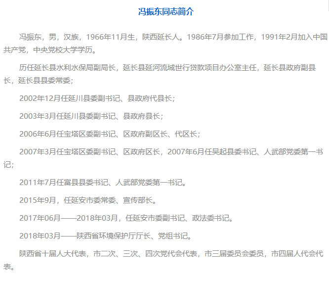 3月31日,陜西省十三屆人大常委會(huì)第二次會(huì)議在西安舉行第二次全體會(huì)議。會(huì)議表決通過陜西省人大常委會(huì)決定任命名單,任命馮振東為陜西省環(huán)境保護(hù)廳廳長。
