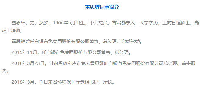 雷思維 任甘肅省環(huán)境保護(hù)廳廳長