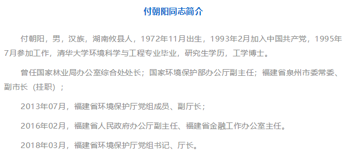 3月30日,福建省十三屆人大常委會(huì)第二次會(huì)議在福州舉行第三次全體會(huì)議。會(huì)議表決通過省人大常委會(huì)決定任命名單,任命付朝陽任福建省環(huán)境保護(hù)廳廳長。