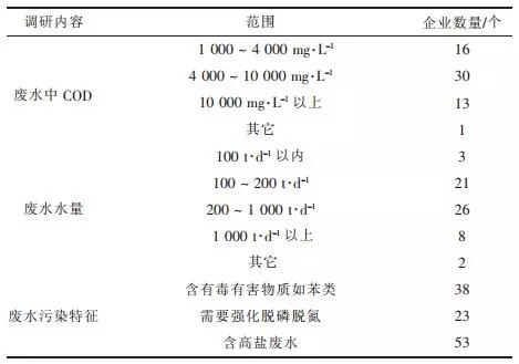 本次調(diào)研主要內(nèi)容和結(jié)果見表1。調(diào)研情況表明,企業(yè)普遍存在排污量大,企業(yè)廢水排放量在200~1000t/d之間的企業(yè)數(shù)占調(diào)查總數(shù)的43%,其中有8家企業(yè)排污量超過1000t/d?;て髽I(yè)不僅排污量大,污染物濃度也普遍較高。處理前COD質(zhì)量濃度在1000~2000mg/L的企業(yè)占比為27%,大約有50%的企業(yè)的污水COD質(zhì)量濃度在4000~8000mg/L,此外還有22%的企業(yè)污水COD質(zhì)量濃度超過10000mg/L,進(jìn)水COD濃度高給污染治理帶來很大難度。