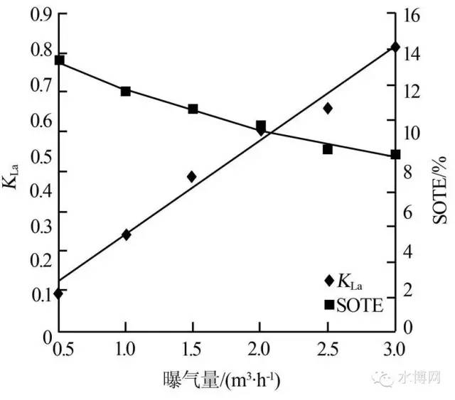 由圖2可知,KLa隨曝氣量的增加而逐漸增大。主要是因?yàn)槠貧饬吭酱螅瑲庖航佑|面積增大,充氧效率提高。另一方面,有研究者發(fā)現(xiàn)氧利用率隨曝氣量的增加而減小,本試驗(yàn)也發(fā)現(xiàn)了類似情況。這是因?yàn)樵谝欢ㄋ钕?,曝氣量較小時(shí)增加了氣泡在水中的停留時(shí)間,氣液接觸時(shí)間延長(zhǎng);曝氣量較大時(shí)對(duì)水體擾動(dòng)較強(qiáng),大部分氧氣未有效利用,最終以氣泡形式從水面釋放到空氣中。本試驗(yàn)得出的氧利用率與文獻(xiàn)相比不高,可能是反應(yīng)器高度不夠,大量氧氣未與水體接觸便逸出,降低了氧利用率。