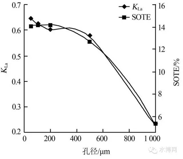 孔徑對(duì)氣泡的形成有很大影響,孔徑越大,氣泡的尺寸越大〔11〕。氣泡對(duì)充氧性能的影響主要表現(xiàn)在兩個(gè)方面:一是單個(gè)氣泡越小,整體氣泡的比表面積越大,氣液間傳質(zhì)接觸面積越大,越有利于氧氣的轉(zhuǎn)移;二是氣泡越大,對(duì)水體的攪動(dòng)作用越強(qiáng),氣液之間混合越快,充氧效果越好。往往第一點(diǎn)在傳質(zhì)過(guò)程中起主要作用。試驗(yàn)將曝氣量設(shè)定為0.5m3/h,考察孔徑對(duì)KLa和氧利用率的影響,見圖4。