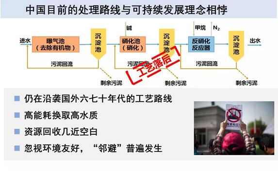 這條路線(xiàn)將污水視為污染物,以大占地、長(zhǎng)流程、高能耗、高物耗的代價(jià),去獲取有限指標(biāo)的達(dá)標(biāo)排放,同時(shí)產(chǎn)生大量污泥、噪聲、臭氣,在城市生活中已成為令人嫌棄的存在。