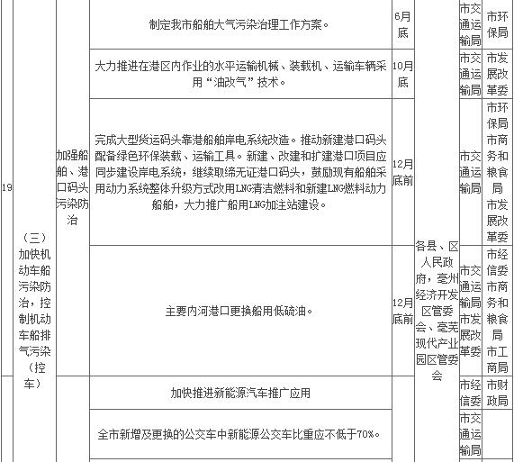 6. 加強船舶、港口碼頭污染防治。2018年6月底前,制定我市船舶大氣污染治理工作方案;2018年10月底前,大力推進在港區(qū)內(nèi)作業(yè)的水平運輸機械、裝載機、運輸車輛采用“油改氣”技術(shù);2018年底前,完成大型貨運碼頭靠港船舶岸電系統(tǒng)改造。推動新建港口碼頭配備綠色環(huán)保裝載、運輸工具。新建、改建和擴建港口項目應(yīng)同步建設(shè)岸電系統(tǒng),繼續(xù)取締無證港口碼頭,鼓勵現(xiàn)有船舶采用動力系統(tǒng)整體升級方式改用LNG清潔燃料和新建LNG燃料動力船舶,大力推廣船用LNG加注站建設(shè)。2018年底前,主要內(nèi)河港口更換船用低硫油(硫含量不高于0.5%m/m的燃油)。(責(zé)任單位:各縣、區(qū)人民政府,亳州經(jīng)濟開發(fā)區(qū)管委會、亳蕪現(xiàn)代產(chǎn)業(yè)園區(qū)管委會;牽頭部門:市交通運輸局,配合部門:市環(huán)保局、市商務(wù)和糧食局、市發(fā)展改革委)