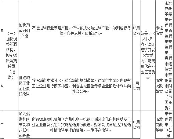 1. 加快燃煤機組超低排放和節(jié)能改造。2018年底前,全市所有燃煤發(fā)電機組(含熱電聯(lián)產(chǎn)機組、循環(huán)流化床機組以及工業(yè)企業(yè)自備機組)全部實施超低排放改造。對不能按計劃達到超低排放改造要求的機組,一律停產(chǎn)改造。(責(zé)任單位:各縣、區(qū)人民政府,亳州經(jīng)濟開發(fā)區(qū)管委會、亳蕪現(xiàn)代產(chǎn)業(yè)園區(qū)管委會;牽頭部門:市發(fā)展改革委,配合部門:市環(huán)保局、市供電公司)
