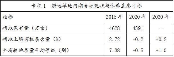 ——耕地。到2020年,嚴守耕地紅線,耕地土壤環(huán)境安全得到基本保障。全省耕地保有量不低于292.73萬公頃(4391萬畝),基本農(nóng)田保護面積不低于246.2萬公頃(3693萬畝),建設(shè)旱澇保收高標準農(nóng)田96.53萬公頃(1448萬畝),建成高標準農(nóng)田2825萬畝。全省耕地質(zhì)量平均提高0.5個等級(別),其中新建成的高標準農(nóng)田耕地質(zhì)量平均提高1個等級(別)以上;耕地土壤有機質(zhì)含量有所增加,耕作層厚度平均達到25厘米以上;實現(xiàn)化肥、農(nóng)藥使用量零增長,環(huán)境風險得到基本管控;實現(xiàn)耕地土壤酸化、重金屬污染、殘膜污染等突出問題基本解決,試點休耕的重金屬污染區(qū)、生態(tài)嚴重退化地區(qū)的生態(tài)和農(nóng)產(chǎn)品質(zhì)量安全問題得到初步解決,重點地區(qū)和試點地區(qū)探索出適于全省借鑒的耕地養(yǎng)護、輪作、休耕工作方案,完成25度以上坡耕地以及重要水源地15至25度非基本農(nóng)田坡耕地新一輪退耕還林、調(diào)出基本農(nóng)田任務(wù)。