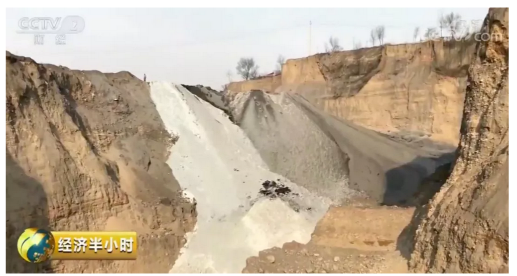 伴隨著發(fā)動機(jī)的轟鳴聲,卡車的后斗被抬起,一整車白色工業(yè)廢渣被傾倒在一個巨大的深坑里,灰色和白色兩種工業(yè)廢渣沿著卡車停過的位置滾落至坑底,從遠(yuǎn)處看,好似兩種不同顏色的“瀑布”。