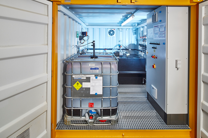 圖10: 原位化學及原位生物修復站。由兩個十尺小集裝箱組成,可機動靈活布置。自動控制??勺詣油都硬煌巹?。