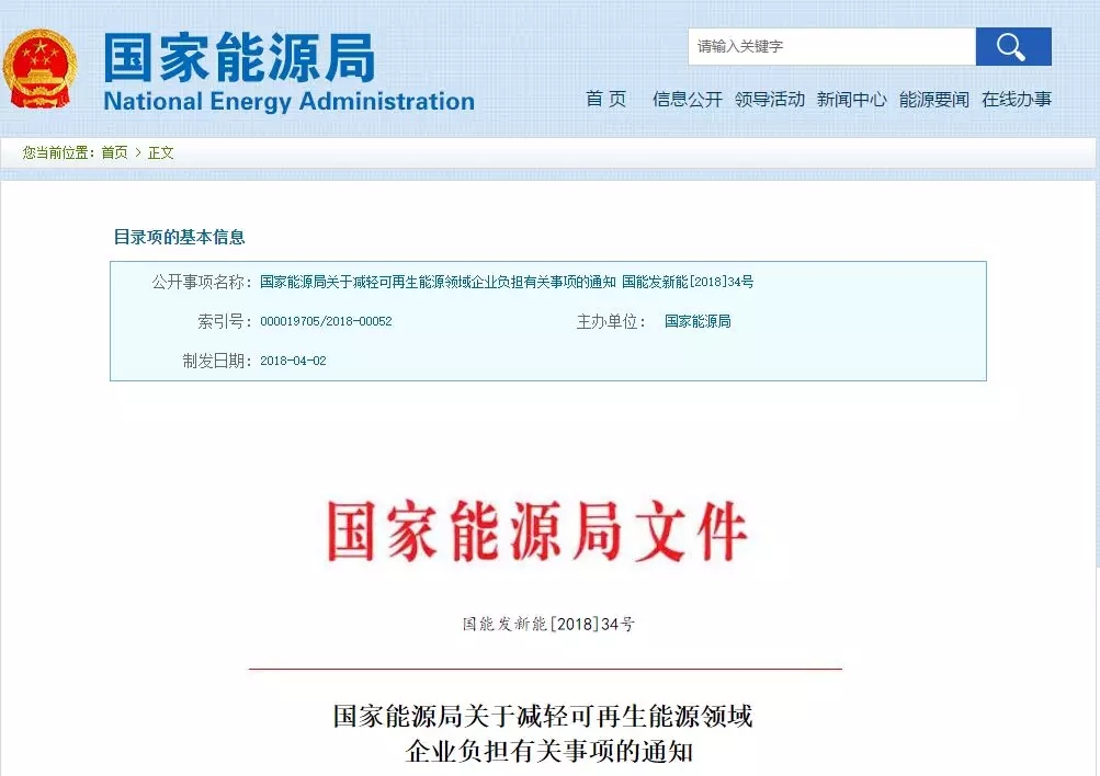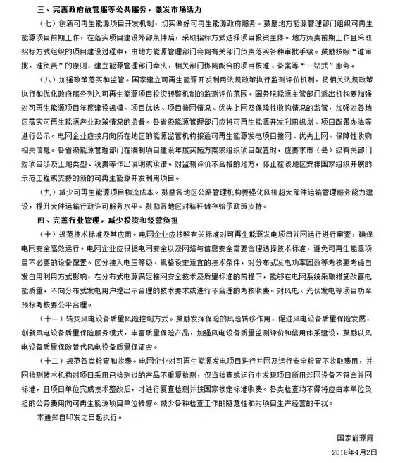 2018年4月26日,國家能源局官網(wǎng)公布《關(guān)于減輕可再生能源領(lǐng)域企業(yè)負(fù)擔(dān)有關(guān)事項(xiàng)的通知》,進(jìn)一步規(guī)范可再生能源行業(yè)管理,減輕可再生能源企業(yè)(含其他機(jī)構(gòu)和個(gè)人投資者)投資經(jīng)營負(fù)擔(dān),促進(jìn)可再生能源成本下降。
