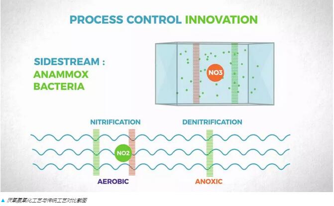 Anammox菌可將氨氮和亞硝酸氮結合轉(zhuǎn)化為氮氣。這個工藝過程節(jié)省了能源,而且占地面積更小。