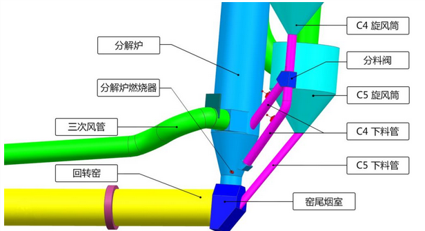 窯尾脫硝燒成系統(tǒng)需對四級旋風(fēng)筒下料管在分解爐下料點的位置需要進(jìn)行優(yōu)化,四級旋風(fēng)筒下料管對分解爐下料點位于三次風(fēng)管之上,高于三次風(fēng)管0.5米以上,將每列單管下料,更改為雙管下料,每單列增加一套分料閥、翻板閥、撒料箱及相應(yīng)的下料管延長。其目的是將相對低溫物料下移,吸收還原區(qū)高溫,凝聚窯氣中析出的堿硫等有害成分,防止結(jié)皮的發(fā)生。