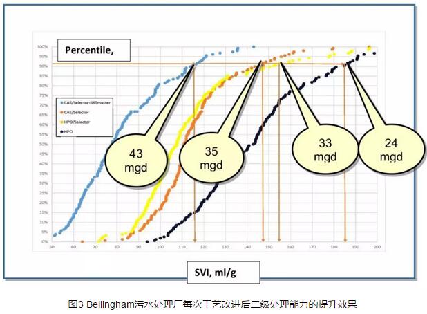 Bellingham污水處理廠最初的設(shè)計是采用純氧曝氣工藝,幾十年來一直受到絲狀菌污泥膨脹問題的困擾,其由低溶氧引起,常出現(xiàn)于SRT較低的環(huán)境。十年前該污水廠開始采用厭氧生物選擇器,之后SVI得到改善,但仍能觀察到SVI偶有上升。近來該污水廠轉(zhuǎn)為采用傳統(tǒng)活性污泥處理系統(tǒng),盡管獲益頗多,但未能解決SVI偶發(fā)上升的問題。在安裝SRT自動控制系統(tǒng)后,SVI的穩(wěn)定性得到顯著提升。圖3為每次升級改造后二級處理工藝的處理能力得到的提升。由圖可知,在安裝SRT自動控制系統(tǒng)后,該污水廠的二級處理能力提升了25%。