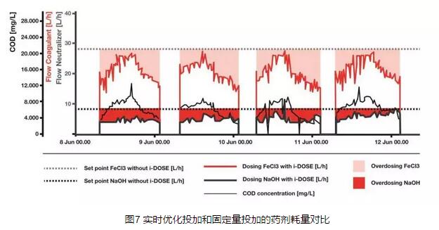 對于50 m3/h的DAF處理系統(tǒng),應(yīng)用i-DOSE系統(tǒng)之后,氯化鐵的消耗量減少了20%,NaOH的消耗量減少了41%,藥劑消耗總量減少了25%;日常檢查和調(diào)整投入的時間減少了50%;產(chǎn)生的污泥量減少了3%;年投入成本節(jié)省了約3萬歐元。此外,根據(jù)實時測得的COD負荷可調(diào)整DAF系統(tǒng)的的氣固比,從而可以減少系統(tǒng)22%~27%的能耗。