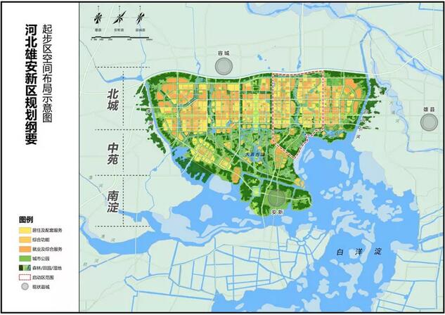 本次新區(qū)規(guī)劃范圍包括雄縣、容城、安新三縣行政轄區(qū)(含白洋淀水域),任丘市鄚州鎮(zhèn)、茍各莊鎮(zhèn)、七間房鄉(xiāng)和高陽縣龍化鄉(xiāng),規(guī)劃面積1770平方公里。選擇特定區(qū)域作為起步區(qū)先行開發(fā),形成“北城、中苑、南淀”的總體空間格局。