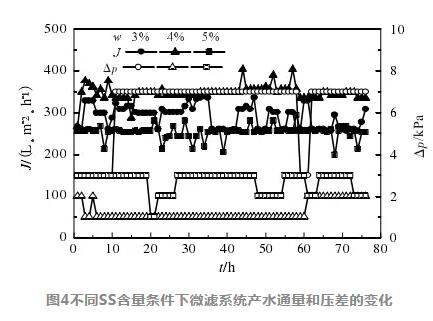 由圖4可知,不同SS含量條件下的產(chǎn)水通量均出現(xiàn)不同程度的波動;壓差在大部分時間內(nèi)保持穩(wěn)定,部分出現(xiàn)降低的點(diǎn)。分析原因是實(shí)驗(yàn)過程中溫度變化造成的,當(dāng)溫度升高時,產(chǎn)水通量增大,壓差會有所降低。