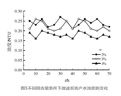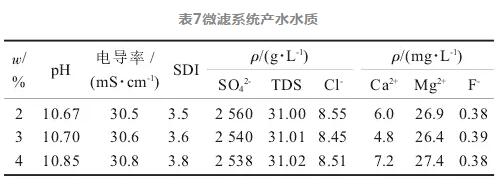 由圖5和表7可知,微濾系統(tǒng)產(chǎn)水濁度在0.16~0.3 NTU小幅波動,膜污染指數(shù)SDI小于3.8。隨著固含量的升高產(chǎn)水濁度略有降低、SDI略有上升??傮w來看系統(tǒng)運(yùn)行穩(wěn)定,而且SS的質(zhì)量分?jǐn)?shù)為3%時的產(chǎn)水通量最大,產(chǎn)水量穩(wěn)定時間更長。