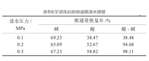 水中的顆粒、有機(jī)物以及膠體等物質(zhì)會在微濾膜表面發(fā)生架橋、吸附進(jìn)而導(dǎo)致膜污堵,因此需要定期對膜進(jìn)行清洗。周衛(wèi)青、李進(jìn)等針對微濾膜的清洗進(jìn)行了相關(guān)研究,確定酸堿聯(lián)合清洗效果最佳。據(jù)此,采用堿洗、酸洗、酸-堿聯(lián)合清洗3個清洗方案,通過恒定進(jìn)水壓力條件下膜的產(chǎn)水通量的變化來表征膜過濾性能的變化。清洗實(shí)驗(yàn)結(jié)果見表8;