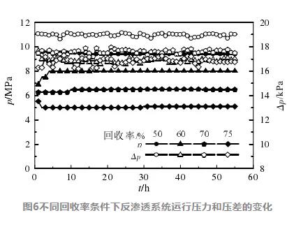 由圖6可知,系統(tǒng)運(yùn)行壓力、壓差均隨著回收率的增大而增大,并且在各個回收率條件下運(yùn)行時,壓力、壓差基本穩(wěn)定。當(dāng)回收率為75%時,設(shè)備運(yùn)行壓力超過了膜元件本身最高操作壓力( 8.3 MPa),影響膜的使用壽命。