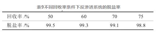 綜合考慮反滲透系統(tǒng)的運(yùn)行壓力、回收率和脫鹽率等因素,確定系統(tǒng)在回收率為70%條件下運(yùn)行時效果最好,此時操作壓力為8.0MPa,產(chǎn)出的淡水、濃水總鹽的質(zhì)量濃度分別為 114.6、0.4 g/L。