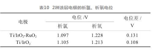 在電解制氯過程中,陽極上發(fā)生的析氧反應(yīng)是析氯反應(yīng)的主要競爭副反應(yīng),它不僅消耗電能,還降低制氯效率,因此陽極材料上發(fā)生的析氧反應(yīng)越小越有利于析氯反應(yīng)的進(jìn)行。實(shí)驗(yàn)對預(yù)選的2種涂層材料的陽極進(jìn)行了析氯、析氧電位測定,結(jié)果如表10所示。