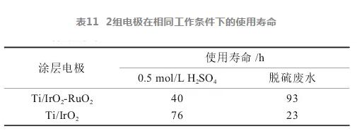 依據(jù)GB/T22839—2010,控制電解液溫度為40 °C 左右、電流密度為2A/cm2,分別以0.5 mol/L的 H2S〇4和減量濃縮后的脫硫廢水做電解液進(jìn)行2組電極的陽極壽命實(shí)驗(yàn),以電解槽電壓升高至5 V所 累計的電解時間作為陽極的強(qiáng)化壽命實(shí)驗(yàn)失效時間,結(jié)果如表11所示。