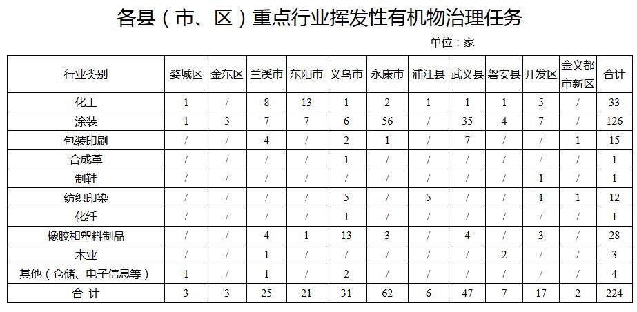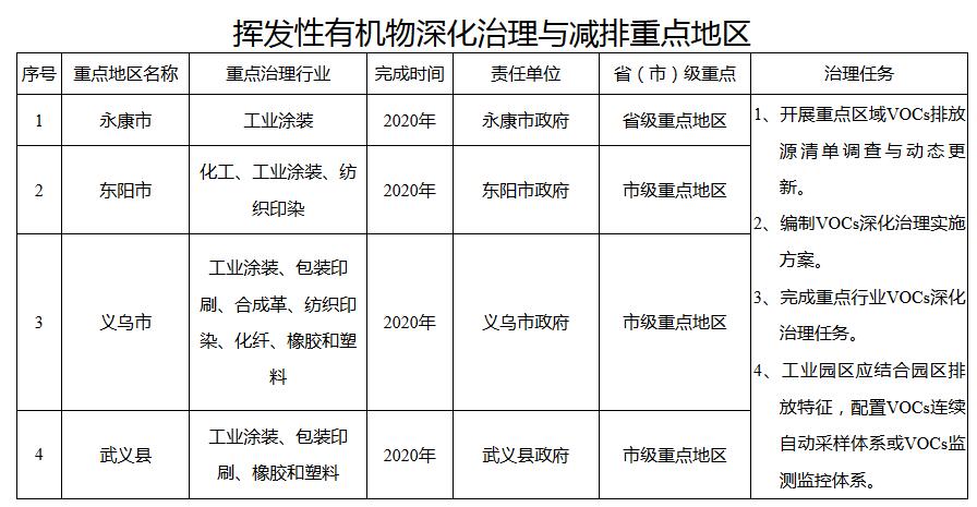 重點推進化工、工業(yè)涂裝、包裝印刷、橡膠和塑料制品、化纖、紡織印染、合成革、制鞋等行業(yè)VOCs污染防治。永康、東陽、義烏、武義等4個省、市重點地區(qū)要編制地區(qū)VOCs深化治理方案。重點企業(yè)要建立完善“一廠一策一檔”制度。