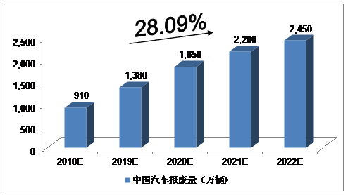 綜合以上因素,我們預(yù)計,2018年中國汽車報廢量將達(dá)到910萬輛,未來五年(2018-2022)年均復(fù)合增長率約為28.09%,2022年中國汽車報廢量將達(dá)到2450萬輛。