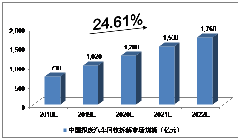 綜合以上因素,我們預(yù)計,2018年中國報廢汽車回收拆解市場規(guī)模將達(dá)到730億元,未來五年(2018-2022)年均復(fù)合增長率約為24.61%,2022年中國報廢汽車回收拆解市場規(guī)模將達(dá)到1760億元。