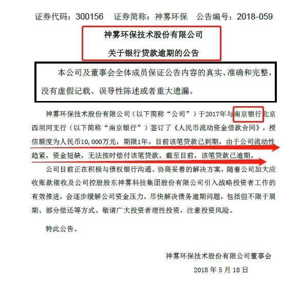 5月19日,神霧集團公告稱,近日收到控股上市子公司神霧環(huán)保銀行貸款逾期事項。神霧環(huán)保南京銀行1億元貸款已到期,由于神霧環(huán)保流動性趨緊,資金短缺,無法按時償付該筆貸款,截至目前該筆貸款已逾期。