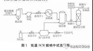 本低溫SCR脫硝中試的工藝流程如圖1所示,采用尾部布設(shè)低溫SCR工藝。流量計(jì)1控制進(jìn)入脫硝中試裝置的煙氣量,煙氣經(jīng)除濕器后由電加熱器加熱。氨氣來(lái)源于液氨鋼瓶,由流量計(jì)2控制進(jìn)入系統(tǒng)的氨氣量,以滿(mǎn)足中試設(shè)定的氨氮摩爾比。流量計(jì)3控制進(jìn)入氨氣稀釋器的空氣量,稀釋后的氨氣在混合器中與煙氣充分混合后進(jìn)入脫硝反應(yīng)器。低溫SCR催化劑裝填于脫硝反應(yīng)器中,反應(yīng)器內(nèi)徑0.3m,催化劑裝填高度約0.24m,催化劑層設(shè)有溫度探頭。中試采用德國(guó)SICK公司生產(chǎn)的S710多組分氣體分析儀對(duì)脫硝反應(yīng)器進(jìn)出口的煙氣組分進(jìn)行連續(xù)在線(xiàn)監(jiān)測(cè)。