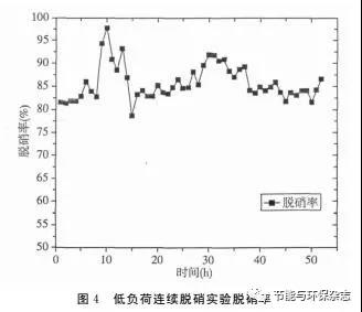 中試期間,由于焦化廠部分工段檢修,焦?fàn)t進(jìn)入低負(fù)荷運(yùn)行狀態(tài),尾氣中NOx濃度均值約500mg/Nm3,故對(duì)低負(fù)荷的煉焦尾氣進(jìn)行連續(xù)脫硝中試。中試條件:進(jìn)入脫硝中試裝置的煙氣流量55m3/h左右,催化劑層溫度150℃,進(jìn)入系統(tǒng)的氨氣的流量0.2L/min。圖4為低負(fù)荷連續(xù)脫硝實(shí)驗(yàn)脫硝率圖,圖示連續(xù)脫硝實(shí)驗(yàn)運(yùn)行時(shí)間為52小時(shí)。脫硝率在78%~98%范圍內(nèi),運(yùn)行期間催化劑活性未出現(xiàn)減弱趨勢(shì),實(shí)驗(yàn)結(jié)果顯示選用的低溫催化劑可用于焦化煙氣的連續(xù)脫硝,并維持高的脫硝率。