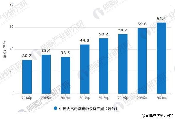 據(jù)前瞻產業(yè)研究院發(fā)布的《大氣污染治理行業(yè)市場前瞻與投資戰(zhàn)略規(guī)劃分析報告》數(shù)據(jù)顯示,2014年,中國大氣污染防治設備產量為30.7萬臺,同比增長11.89%;2015年,產量為35.4萬臺,同比增長5.9%;2016年1-9月,產量達到33.5萬臺,同比增長23.2%。到2017年中國大氣污染防治設備產量將達到44.8萬臺,未來五年(2017-2021)年均復合增長率約為9.50%,預計2018年,產量將達50.2萬臺,到了2021年中國大氣污染防治設備產量將達到64.4萬臺。