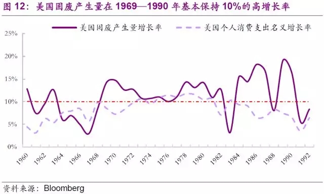 二戰(zhàn)后,美國新技術(shù)革命的推動(dòng)(主要原因)與國民經(jīng)濟(jì)的軍事化(越南戰(zhàn)爭(zhēng))極大地刺激了經(jīng)濟(jì)的增長(zhǎng)。利用戰(zhàn)后經(jīng)濟(jì)優(yōu)勢(shì)地位和國外廉價(jià)資源(石油等),美國的現(xiàn)代跨國公司大力拓展世界市場(chǎng),極大地獲取高額利潤(rùn),使得美國國內(nèi)經(jīng)濟(jì)持續(xù)發(fā)展,西部和南部呈現(xiàn)繁榮之象并且造就了一個(gè)黃金時(shí)代。高速發(fā)展的黃金時(shí)期,美國居民生活水平持續(xù)提高,個(gè)人消費(fèi)增速明顯,進(jìn)而帶動(dòng)固廢量持續(xù)走高,這段時(shí)期也是固廢行業(yè)蓬勃發(fā)展的第三階段。