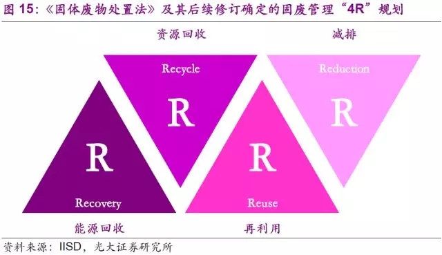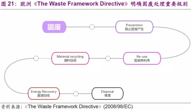 如果分析中國、美國、日本/西歐在固廢行業(yè)的發(fā)展,基本是逐漸完善固廢最大化利用產(chǎn)業(yè)鏈的過程。中國的垃圾填埋和垃圾焚燒技術(shù)已經(jīng)相對(duì)成熟,國家在《“十三五”全國城鎮(zhèn)生活垃圾無害化處理設(shè)施建設(shè)規(guī)劃》中也規(guī)定了2020年城市垃圾無害化處理達(dá)到100%的指標(biāo)要求。但是在處置前端的垃圾分類,以及后端的回收利用,中國距發(fā)達(dá)國家仍有較大的差距。美國擁有完善的固廢收運(yùn)和處理系統(tǒng),但是由于前端垃圾分類的不徹底,導(dǎo)致后端回收利用率受限。日本/西歐則是目前行業(yè)發(fā)展金字塔的頂端。兩個(gè)地區(qū)擁有完善的前端垃圾分類和收運(yùn)轉(zhuǎn)運(yùn)體系,垃圾焚燒和循環(huán)再造業(yè)務(wù)則是兩個(gè)地區(qū)后端處置的不同特色。