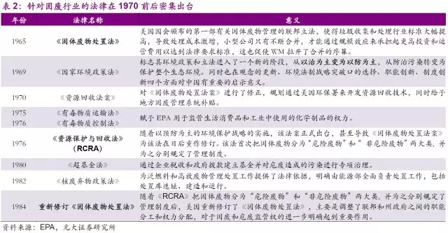 雖然以上法律法規(guī)的頒布和公司所處的固廢行業(yè)并無太大的關(guān)聯(lián),但這段時(shí)期環(huán)保領(lǐng)域法律法規(guī)的密集出臺(tái),拉開了美國政府正式通過行政干預(yù)環(huán)境治理以及扶持環(huán)保產(chǎn)業(yè)崛起的序幕,對(duì)固廢行業(yè)的發(fā)展打下了堅(jiān)實(shí)的基礎(chǔ)。