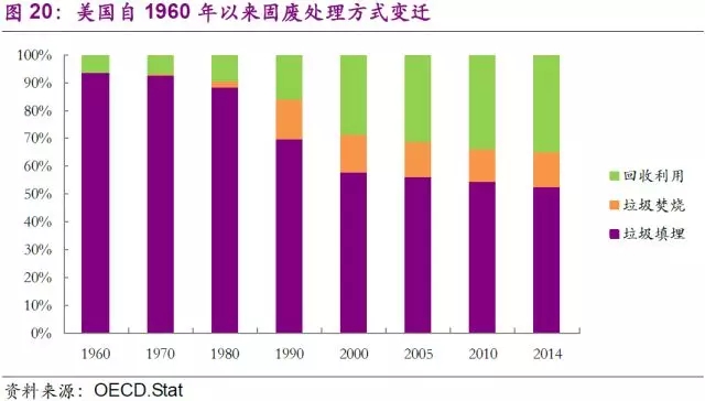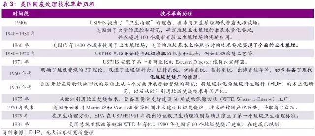 固廢行業(yè)的技術(shù)發(fā)展同樣是制約市場(chǎng)和公司發(fā)展的另一個(gè)決定性因素。早在1940年,美國公共衛(wèi)生署(USPHS)便開始推行了一系列固廢處置的技術(shù)性試驗(yàn),從“衛(wèi)生填埋代替露天堆放”,到“垃圾堆肥的探索和試驗(yàn)”,再到“垃圾焚燒”,最后到了如今大力推廣的“廢物能源回收”的綜合利用。