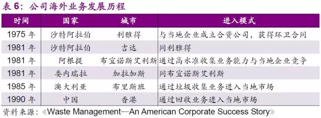 在美國成功擴(kuò)張的同時(shí),WMI也抓住了在國際市場(chǎng)上發(fā)展的機(jī)遇。1975年,公司通過與當(dāng)?shù)仄髽I(yè)成立合資公司的方式,成功的打開了沙特首都利雅得的環(huán)衛(wèi)市場(chǎng),這也是世界上第一個(gè)跨國的環(huán)衛(wèi)合同。這個(gè)合同的示范效應(yīng)給了WMI世界范圍的關(guān)注。1980年,公司先后成功進(jìn)入了阿根廷、委內(nèi)瑞拉、澳大利亞、部分歐洲國家,以及香港的危廢及環(huán)衛(wèi)市場(chǎng),并于1990年成為了世界最大的固廢龍頭。
