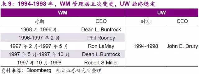 值得一提的是UW高速發(fā)展的源動(dòng)力,公司CEO John E.Drury。作為Browning-Ferris Industries(以下簡(jiǎn)稱“BFI”)的總裁兼COO,Drury用了10年時(shí)間引領(lǐng)BFI成為全美第二大固廢公司的位置,然而因?yàn)椴唤邮芄綜EO大力發(fā)展垃圾回收行業(yè)的決定,離開公司并于1994年擔(dān)任UW的CEO。Drury僅花了3年時(shí)間,通過1995年的5次大型收購,以及1996年的30次小型收購,將公司的營(yíng)業(yè)收入從1994年的434萬美元大幅增長(zhǎng)至1997年的26億美元,增速高達(dá)598倍。