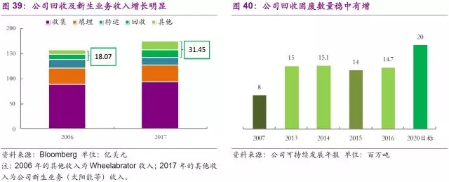 隨著固廢傳統(tǒng)市場(chǎng)業(yè)務(wù)趨于飽和,公司也在積極求變。一方面,公司利用自有團(tuán)隊(duì)積極研發(fā)已有業(yè)務(wù)的轉(zhuǎn)型,另一方面,公司先后在2009至2016年,通過多次收購成熟的專業(yè)化新生公司,拓展了醫(yī)廢、有機(jī)垃圾、建筑垃圾、電子回收等市場(chǎng),并取得了一定成績(jī)。需要注意的是,公司的以上收購雖涉及不同細(xì)分領(lǐng)域,但核心觀念一致,即加大資源回收再利用,這也契合美國固廢市場(chǎng)的轉(zhuǎn)型,進(jìn)一步優(yōu)化完善固廢處理全產(chǎn)業(yè)鏈發(fā)展。