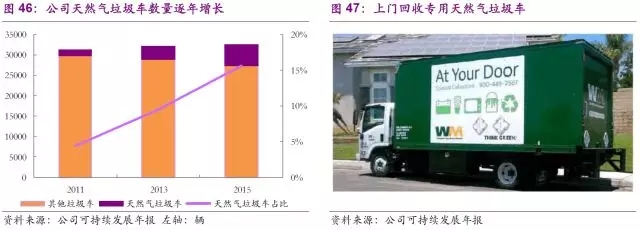 在此基礎(chǔ)上,公司也在領(lǐng)先研究填埋沼氣—天然氣的市場(chǎng)化進(jìn)程。公司先是于2005年在加州建立了全球最大的填埋沼氣—LNG處理廠,隨后分別于2014和2016年在俄亥俄州和伊利諾伊州建立了兩座填埋沼氣—壓縮天然氣處理廠。上述天然氣的產(chǎn)出在兩方面得到利用:一是用于公司自有的垃圾收集車(40%),二是進(jìn)入天然氣管網(wǎng)銷售,在降低公司運(yùn)營(yíng)成本的同時(shí)也提供了一定營(yíng)收。