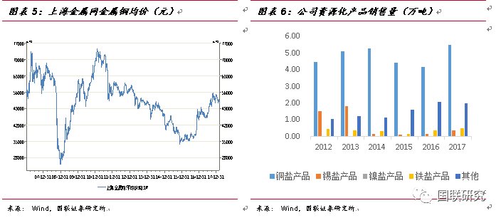 公司工業(yè)廢物資源化利用業(yè)務(wù)亦為公司重要主營業(yè)務(wù)之一。由于資源化業(yè)務(wù)不僅受到產(chǎn)能和產(chǎn)品銷量影響,還與大宗商品的價格波動息息相關(guān)。公司資源化產(chǎn)品主要包括銅鹽、錫鹽、鎳鹽和鐵鹽產(chǎn)品等。2016年前,受到國際基本金屬價格下跌、行業(yè)競爭加劇的影響,公司資源化業(yè)務(wù)營收略有下降。2012至2016年,公司資源化業(yè)務(wù)營收由9.39億元降低至7.91億元,毛利率維持在30%左右,而2017年,公司資源化業(yè)務(wù)營收11.82億,同比增長49.33%,主要是因為各基地資源化產(chǎn)銷量增加、重金屬價格上升、加之公司加大海外銷售等。
