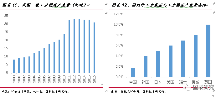危廢實際產(chǎn)生量遠高于生態(tài)環(huán)境部統(tǒng)計值。對于我國危廢實際產(chǎn)生量,我們認為可以采用以下兩種方式進行測算:①對比發(fā)達國家危廢產(chǎn)量測算法:2007-2016年我國一般工業(yè)固廢產(chǎn)量由17.6億噸增長到30.9億噸,年復(fù)合增長率為6.45%。對比部分發(fā)達國家的危廢與工業(yè)固廢占比可以發(fā)現(xiàn),韓國為4%,日本5%,英國比例最高為10%,而中國的比例僅為1.7%,差距較為明顯。即使按照韓國4%的危廢占工業(yè)固廢比例進行保守測算,2016年我國危廢實際產(chǎn)量預(yù)估將達1.24億噸。