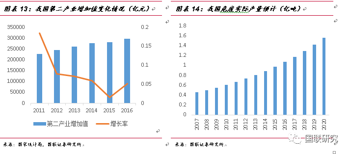 ②第二產(chǎn)業(yè)增加值測算法:由于危廢排放的企業(yè)多數(shù)來自于化工、有色等中游制造企業(yè),我們認為危廢的實際產(chǎn)生量將與第二產(chǎn)業(yè)的景氣度是呈現(xiàn)正相關(guān)性。2007年至2016年,我國第二產(chǎn)業(yè)的增加值由11.58萬億元增長到29.65萬億元,復(fù)合增長率達9.91%,2007年污染源第一次普查時危廢實際產(chǎn)量為4573萬噸,在默認普查數(shù)據(jù)為準(zhǔn)確數(shù)據(jù)的情況下,按照9.91%的危廢增長速率進行測算,2016年我國危廢實際產(chǎn)生量將達到1.07億噸。