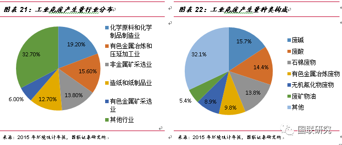 工業(yè)危廢的主要來源及種類構(gòu)成。鑒于對危險廢物的認識不斷深入,在2016年6月21日,生態(tài)環(huán)境部重新修訂了《國家危險廢物名錄》,將危廢由49大類重新調(diào)整為46大類,新增117種類別,共計479種,而其中70%以上的危廢都來自于工業(yè)行業(yè)。據(jù)2015年環(huán)境統(tǒng)計年報數(shù)據(jù)統(tǒng)計,工業(yè)危廢中產(chǎn)量最大的行業(yè)分別為化學(xué)原料與化學(xué)制品制造業(yè)(占比19.2%)、有色金屬冶煉和壓延加工(占比15.6%)、非金屬礦采選業(yè)(占比13.8%)以及造紙和紙制品業(yè)(占比12.7%)。