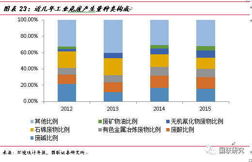根據(jù)2015年環(huán)境統(tǒng)計年報的數(shù)據(jù),工業(yè)危廢產(chǎn)生量種類構(gòu)成中產(chǎn)量最大的依次分別為廢堿 623.0 萬噸(占比15.7%)、廢酸 571.2 萬噸(占比14.4%)、石棉廢物 549.2 萬噸(占比13.8%)、有色金屬冶煉廢物 388.9 萬噸(占比9.8%)、無機氰化物廢物 355.5 萬噸(占比8.9%)以及廢礦物油 213.0 萬噸(占比5.4%),適合于采用資源化利用的廢堿、廢酸、有色金屬冶煉廢物等占工業(yè)危廢約為40%。從產(chǎn)業(yè)調(diào)研情況來看,危廢資源化空間將進一步縮小,而無害化則處于供不應(yīng)求狀態(tài),近些年隨著監(jiān)管的趨嚴(yán),無害化處理的占比將提高,未來空間將被放大。