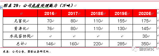 公司始終專注于危險廢物的無害化處理及資源化利用,憑借自身突出的技術(shù)優(yōu)勢、資深的管理經(jīng)驗以及資本優(yōu)勢等,公司在危廢處理行業(yè)持續(xù)鞏固龍頭運營商的地位。截至2017年,公司擁有工業(yè)危險廢物處理資質(zhì)達160萬噸/年,在行業(yè)內(nèi)遙遙領(lǐng)先。按照公司未來幾年規(guī)劃產(chǎn)能,2020年預(yù)計公司將擁有350萬噸/年的綜合治理產(chǎn)能,包括水泥窯協(xié)同處置產(chǎn)能,CAGR達29.81%。對比我們上文對公司未來產(chǎn)能空間的測算,假設(shè)市占率2.26%保持不變,公司預(yù)期產(chǎn)能352.8萬噸,所以我們判斷公司規(guī)劃的產(chǎn)能實現(xiàn)概率很高。